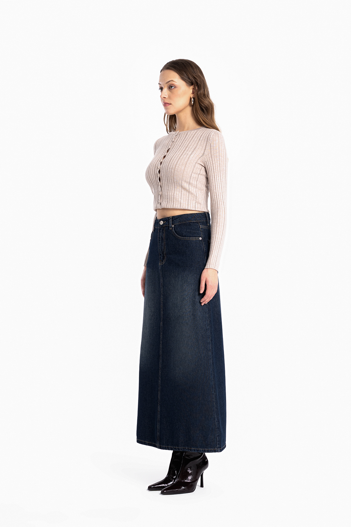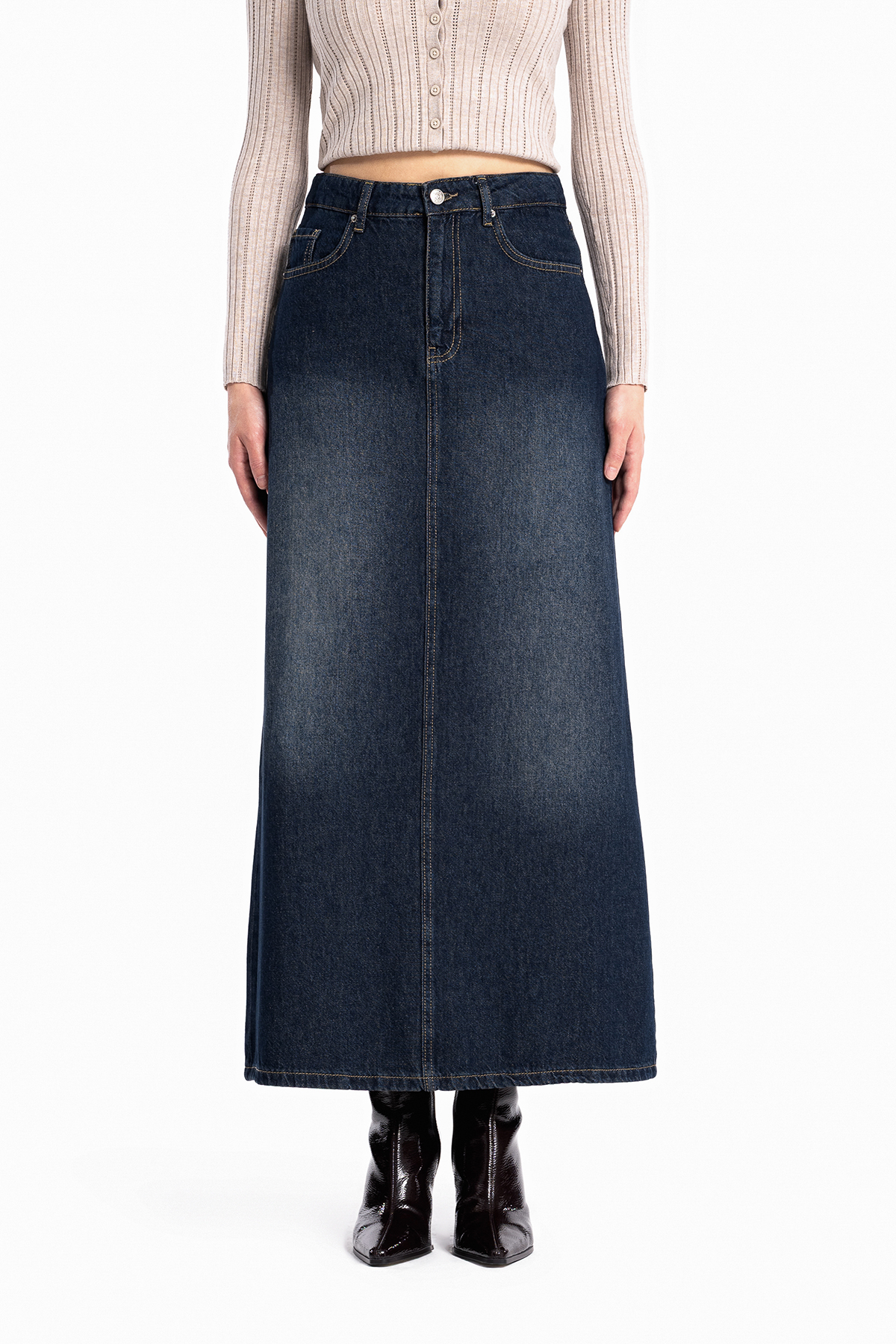 Yüksek bel, düğmeli ve fermuarlı, tam kalıp, kot etek